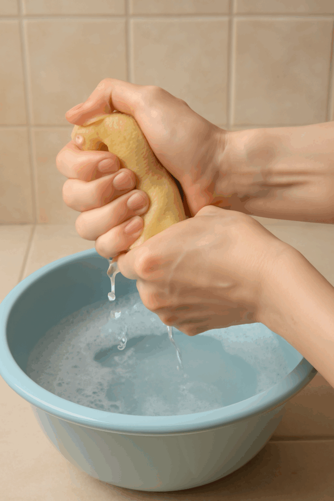 Gently squeeze the pads underwater. Don’t scrub or twist them – foam is delicate and tears easily. Just give them a nice, gentle squeeze to work the soap through.